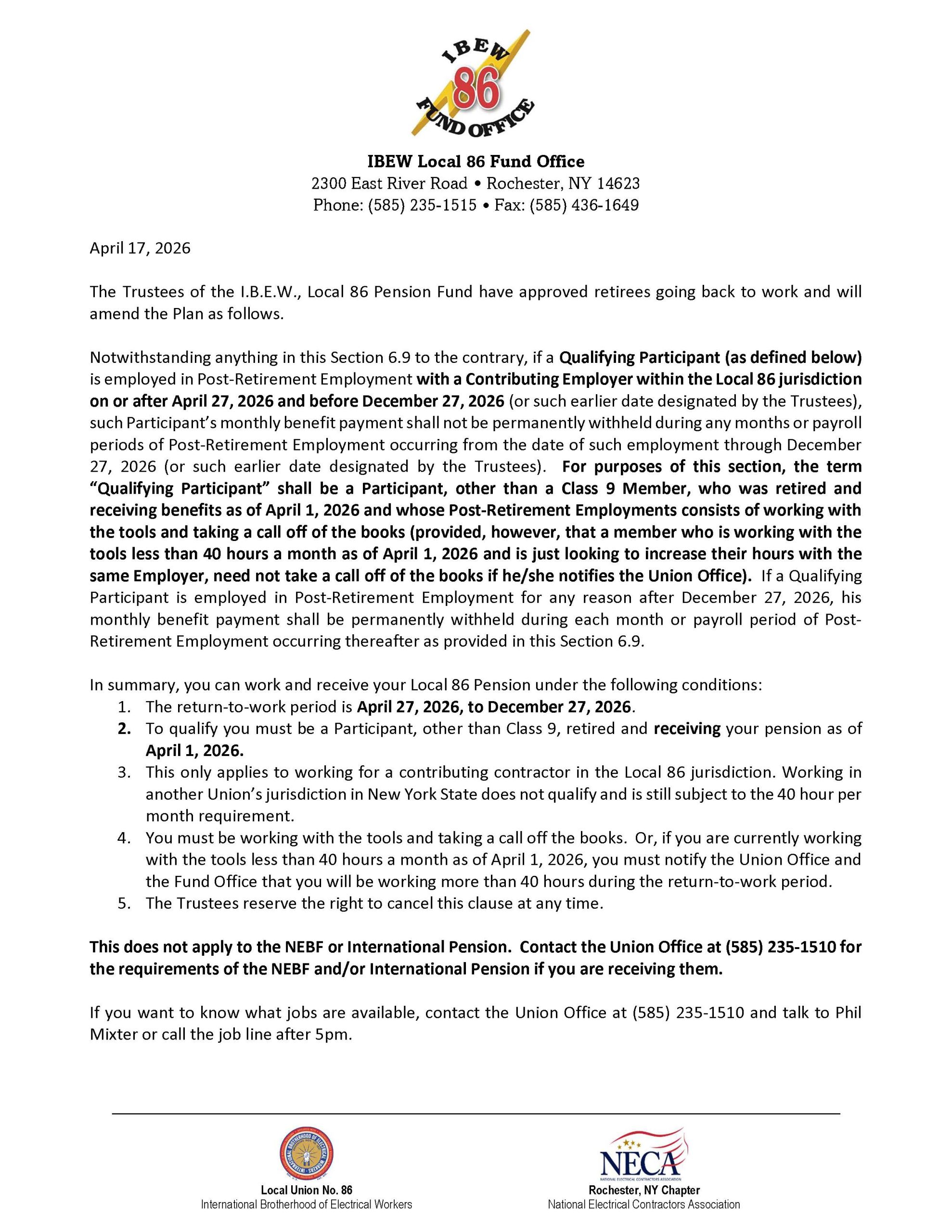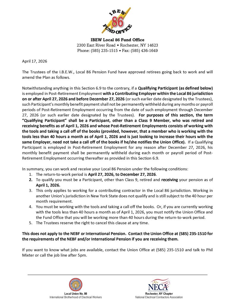 IBEW Local 86 along with Ferguson Electric are in need of Journeyman Wireman for the U of R Bed Tower Project.