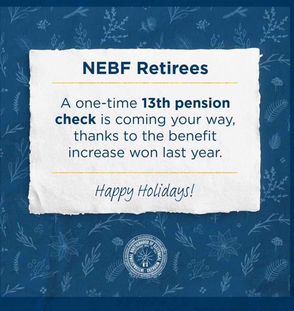 Just an FYI for any retired members that started collecting their NEBF pension before 1/1/25, a one-time 13th check is going out to you this month. Also, the new calculator for the NEBF for active members has gone from $32 a credit to $33 a credit.